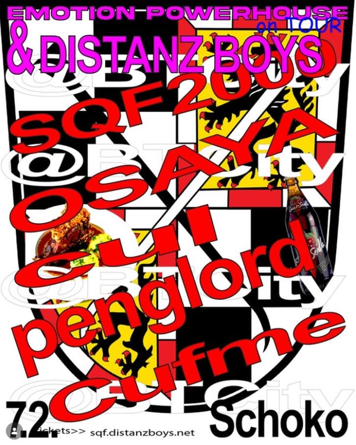 Mit dabei sind SQF2000 (live), Penglord und Osaya, die den Dancefloor zuverlässig auf links drehen. Als Voracts liefern die Bayreuther Locals Cul sowie die DistanzBoys als Hosts des Abends standesgemäßen fränkischen TurnUp. Abgerundet wird das Line-up von Bayreuths DJ-Prodigy Cufme – gude Gschicht.